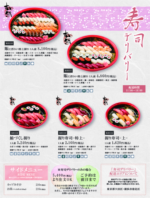 ・ご予約はお届け日の5日前までにお願いいたします。 ・15,000円以上の注文より承ります。 ・配達料は無料です。 ・受け渡し時間は11:00~18:00までとなります。(それ以外で希望の場合はご相談ください。) ・配達エリアに関してご注文金額毎に異なりますので、別途記載の配達エリアをご確認ください。
