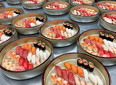本日は横浜市のある場所で行われたセレモニーにてお出しするお料理をケータリングいたしました。今が旬の「鯵」と「イサキ」を盛り込んだ握り寿司がおすすめです。