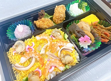 本日は横浜市鶴見区にあるお家にお弁当をお届け。期間限定で販売している「春の特別弁当」のご注文をいただきました。春らしい華やかな彩りでご好評をいただいております。